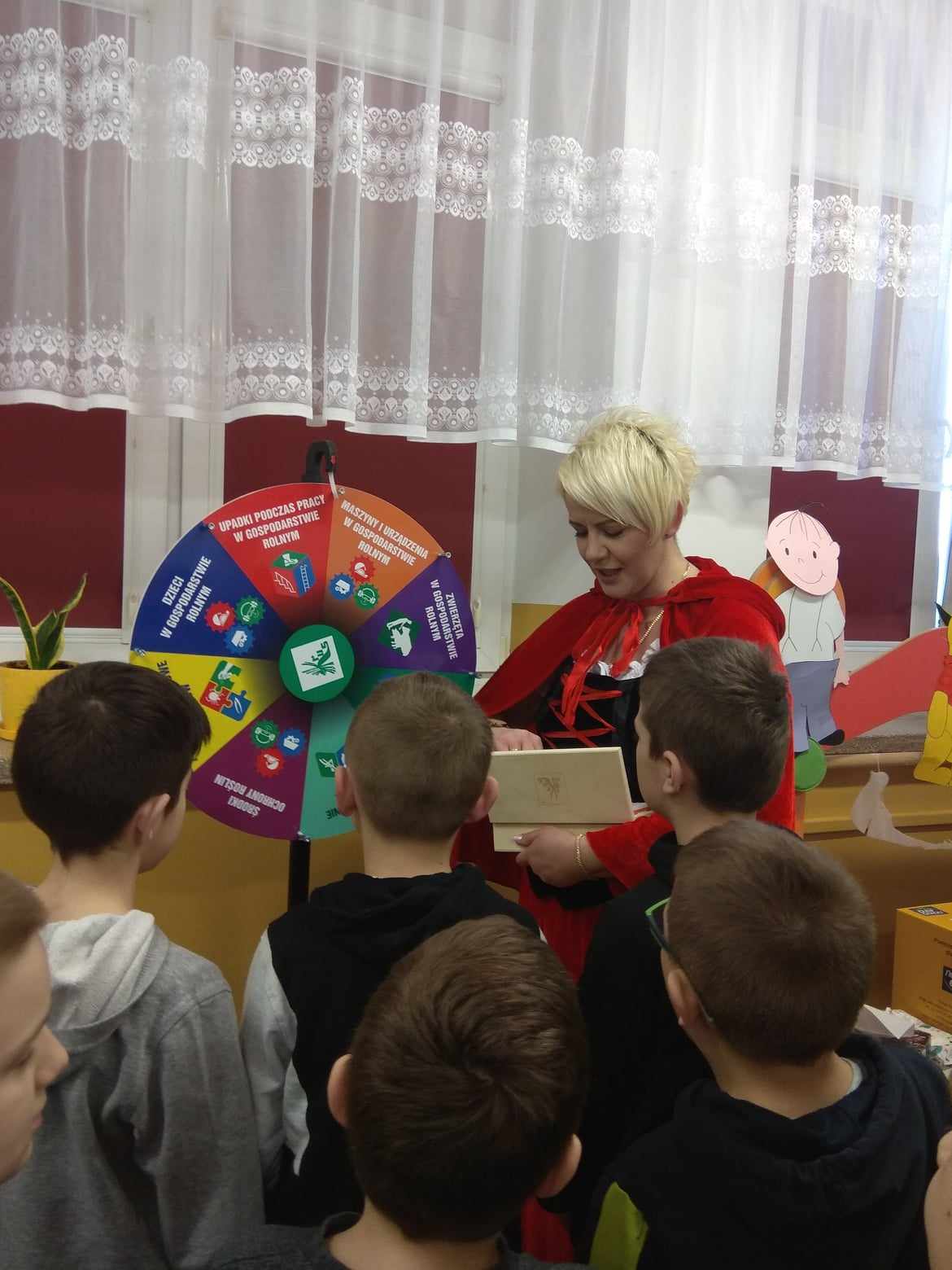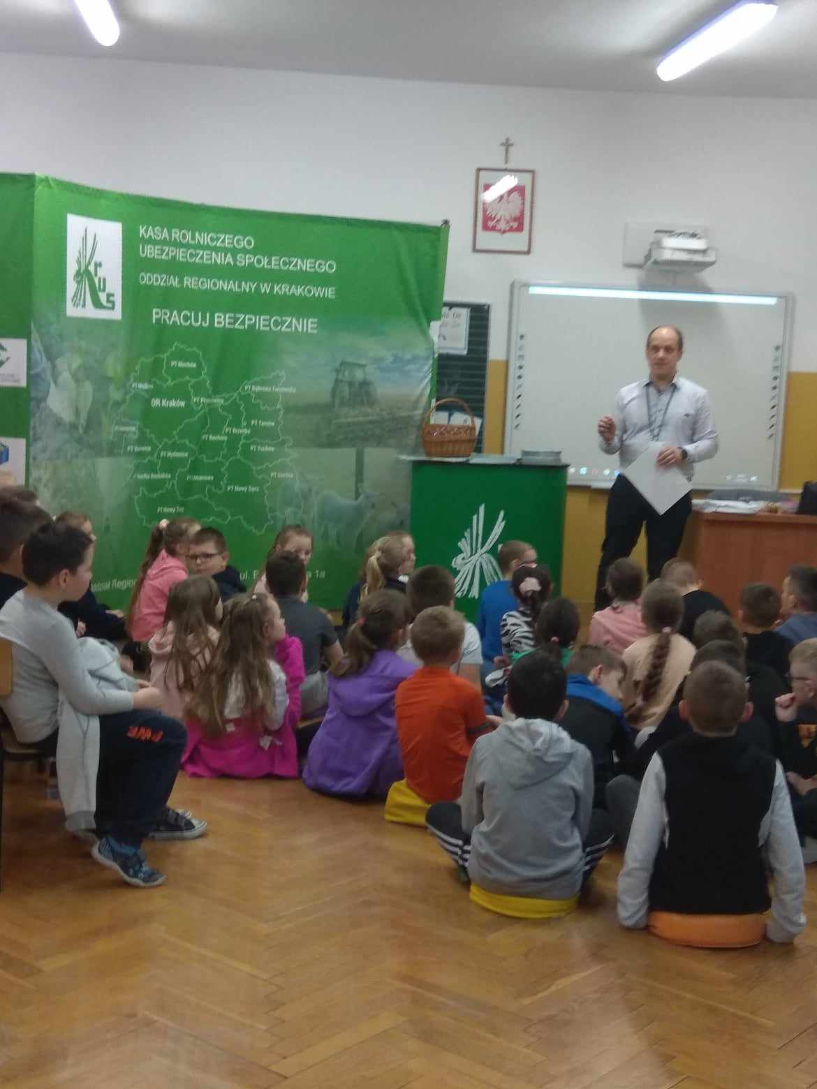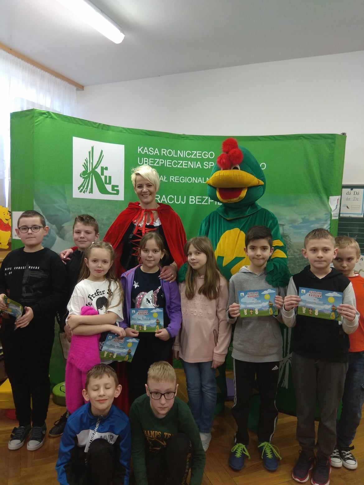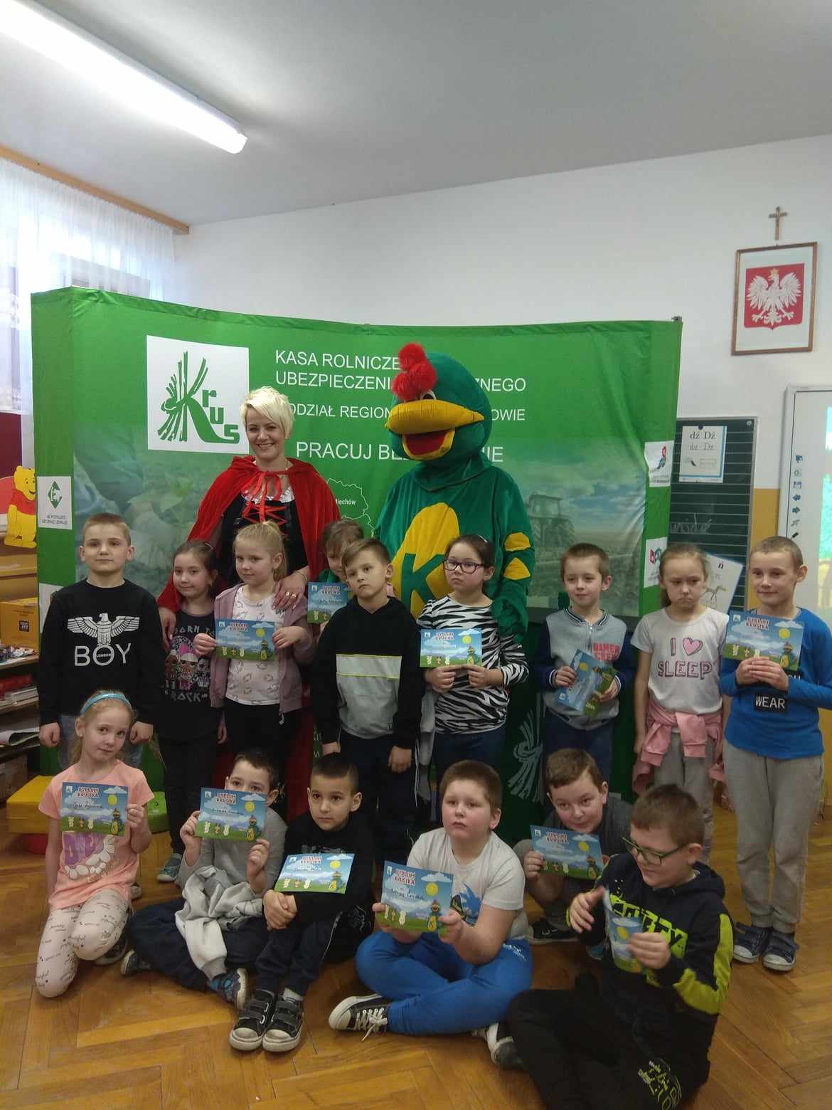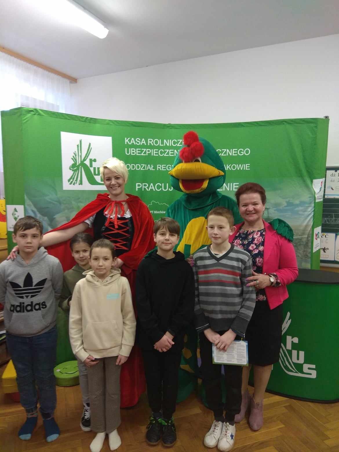 15 marca 2023r. gościli w naszej  z przedstawiciele Kasy Rolniczego Ubezpieczenia Społecznego z Dąbrowy Tarnowskiej. Pan Łukasz Pajdo wygłosił prelekcję oraz wyświetlił film   nt. Bezpiecznie na wsi mamy , niebezpiecznych substancji unikamy”. Wraz z nim gościli : smok Krusik i Czerwony Kapturkiem. Przygotowali oni wiele ciekawych  zabaw i konkursów na temat bezpieczeństwa dla uczniów naszej szkoły.
