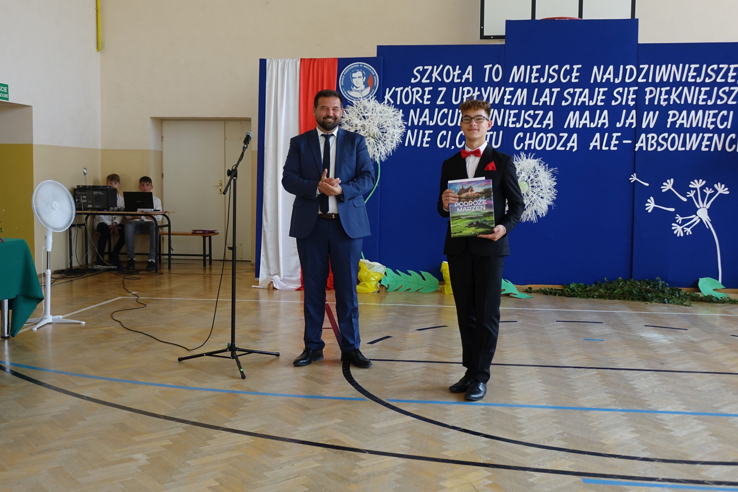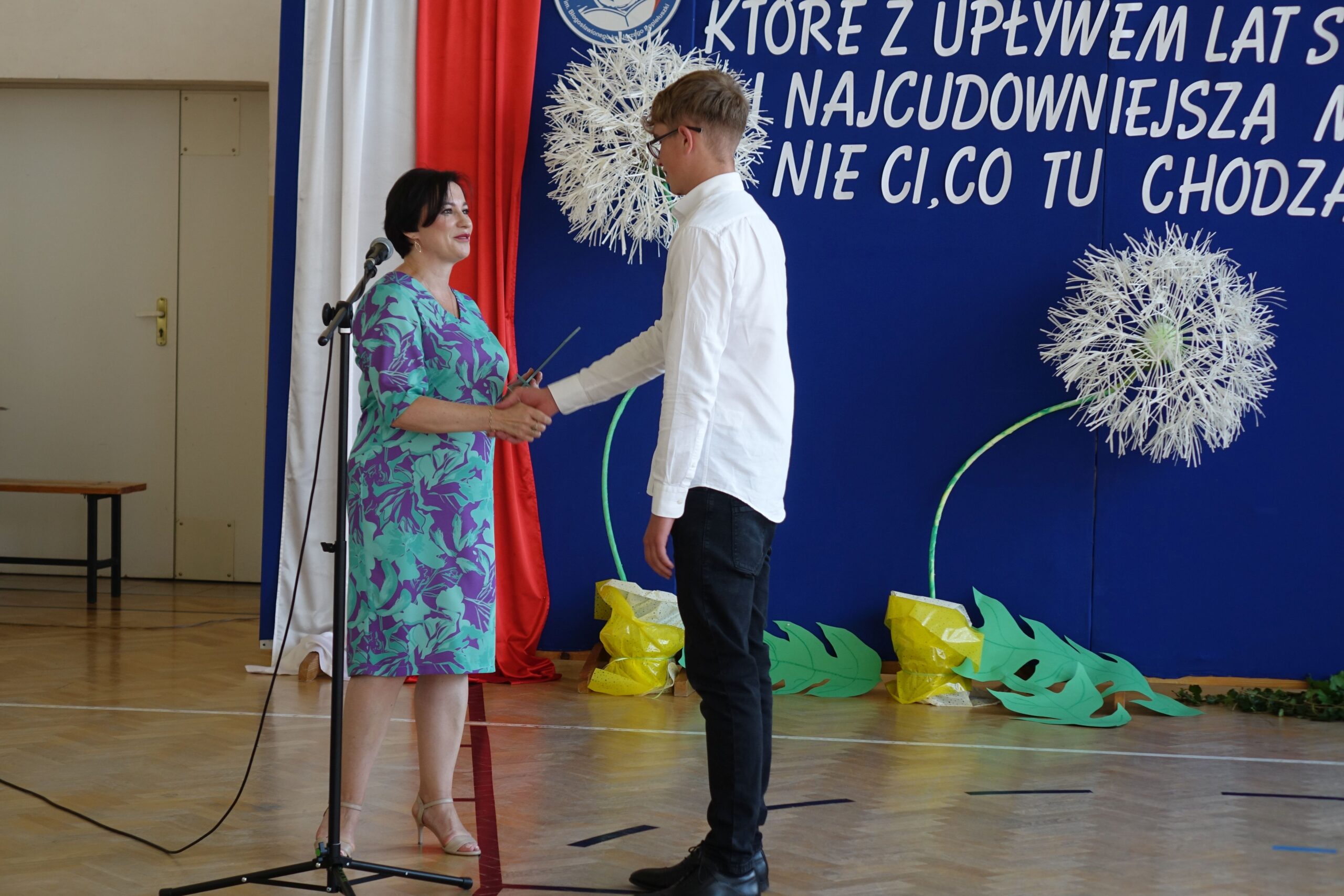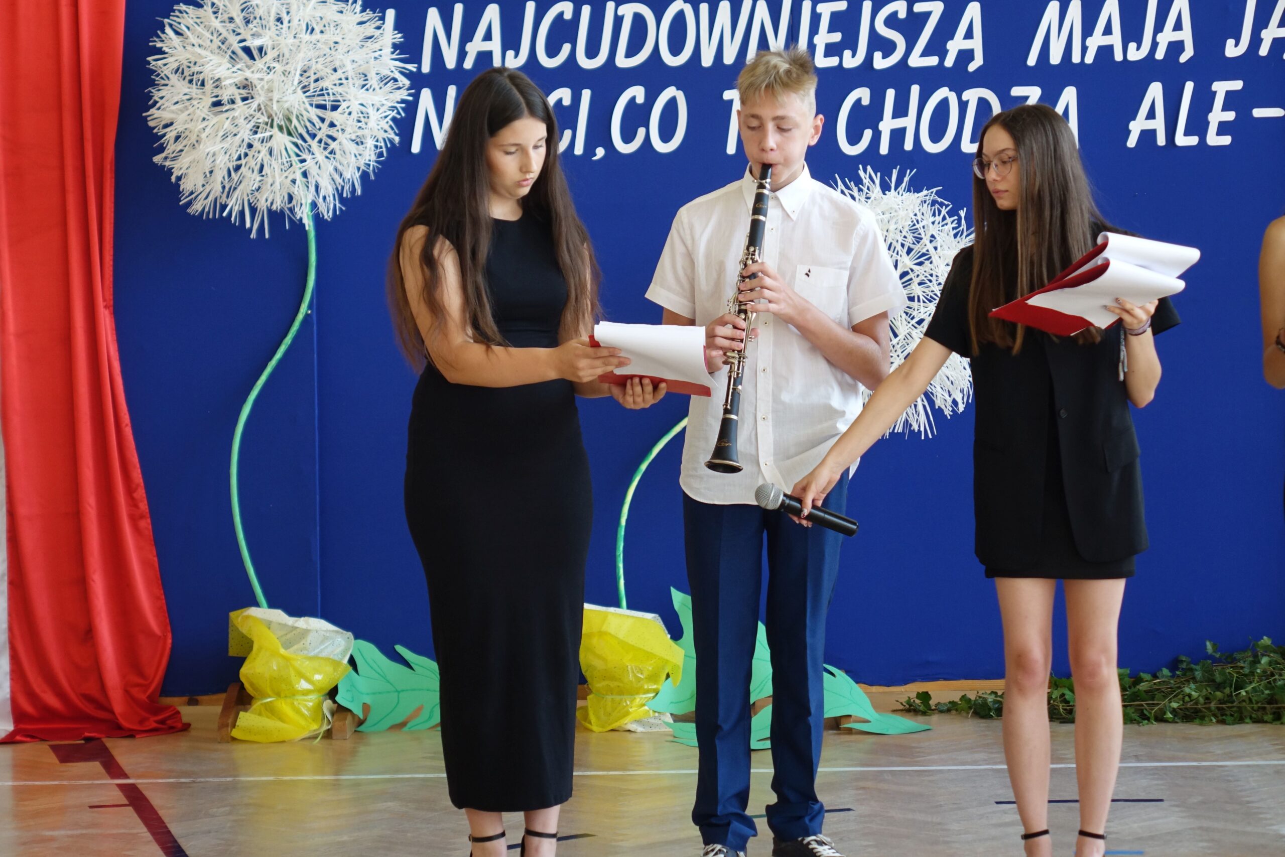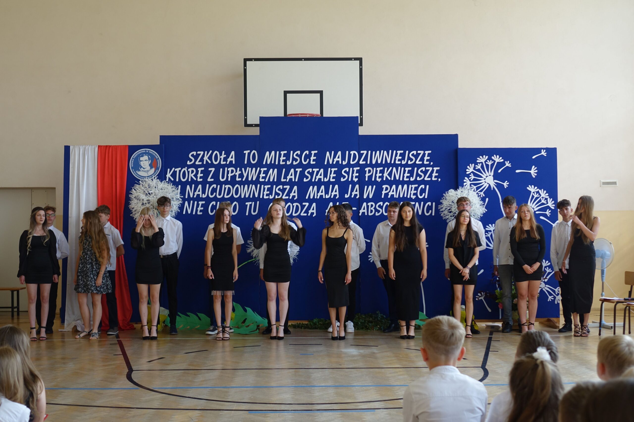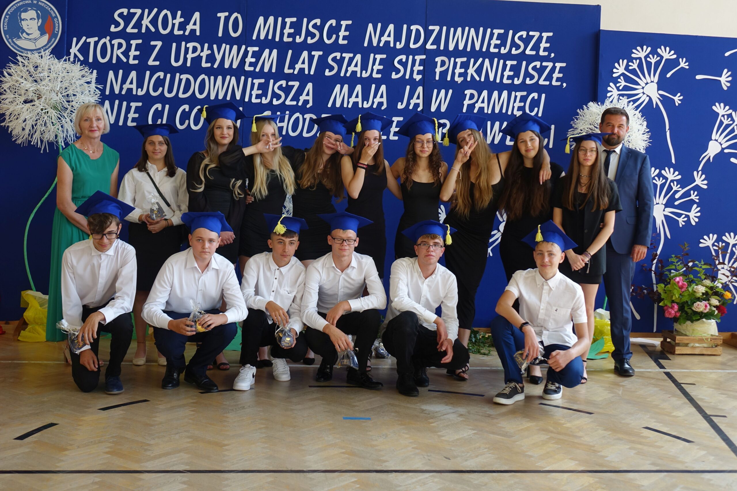 W części artystycznej uczniowie klasy ósmej przedstawili program, w którym w humorystyczny sposób skierowali wiele ciepłych słów, dziękując panu dyrektorowi za szkołę, w której czuli się bezpieczni i doceniani, nauczycielom za przekazaną wiedzę i ciekawość świata, a .rodzicom za trud wychowania.