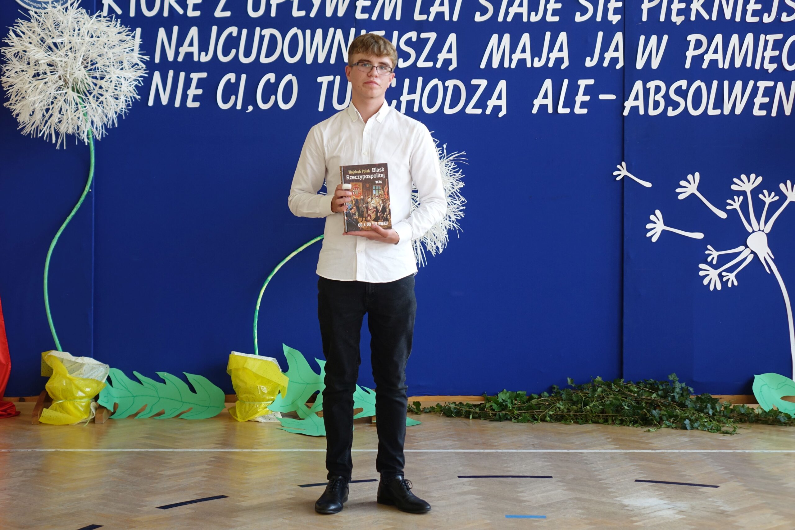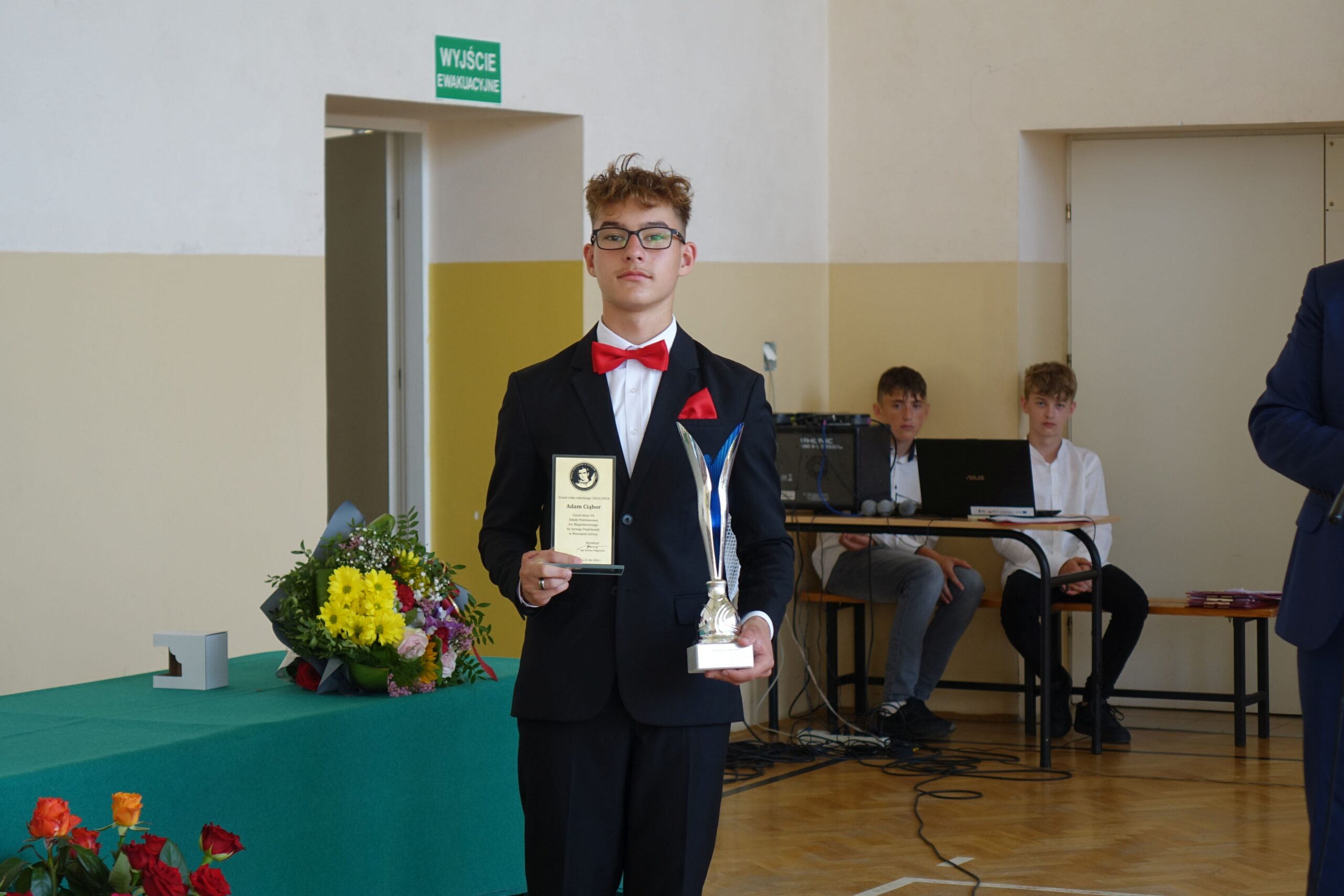 Podczas swojego wystąpienia pan dyrektor wręczył statuetkę Ucznia Roku 2023/2024. Został nim Adam Ciąbor z klasy VII.