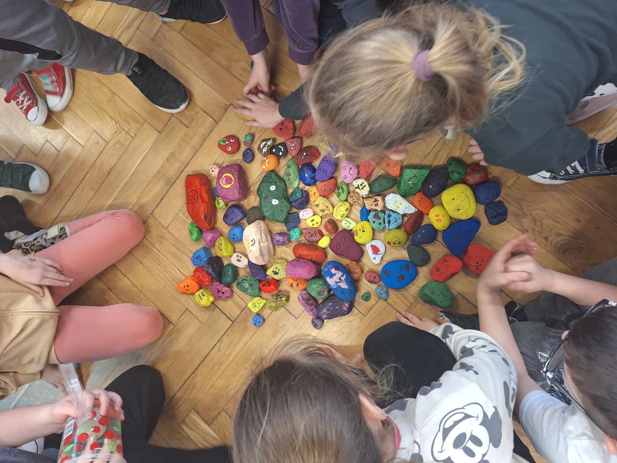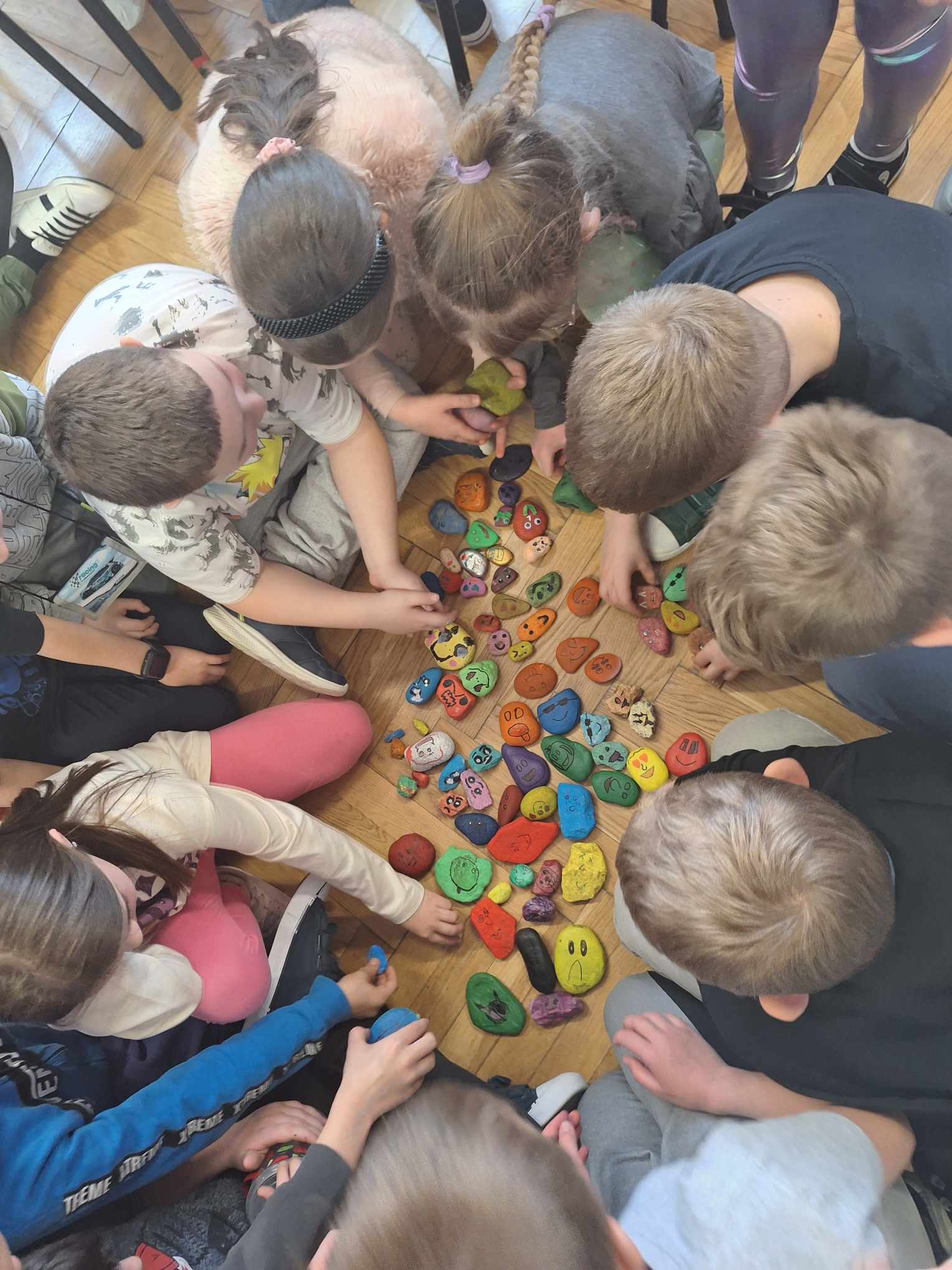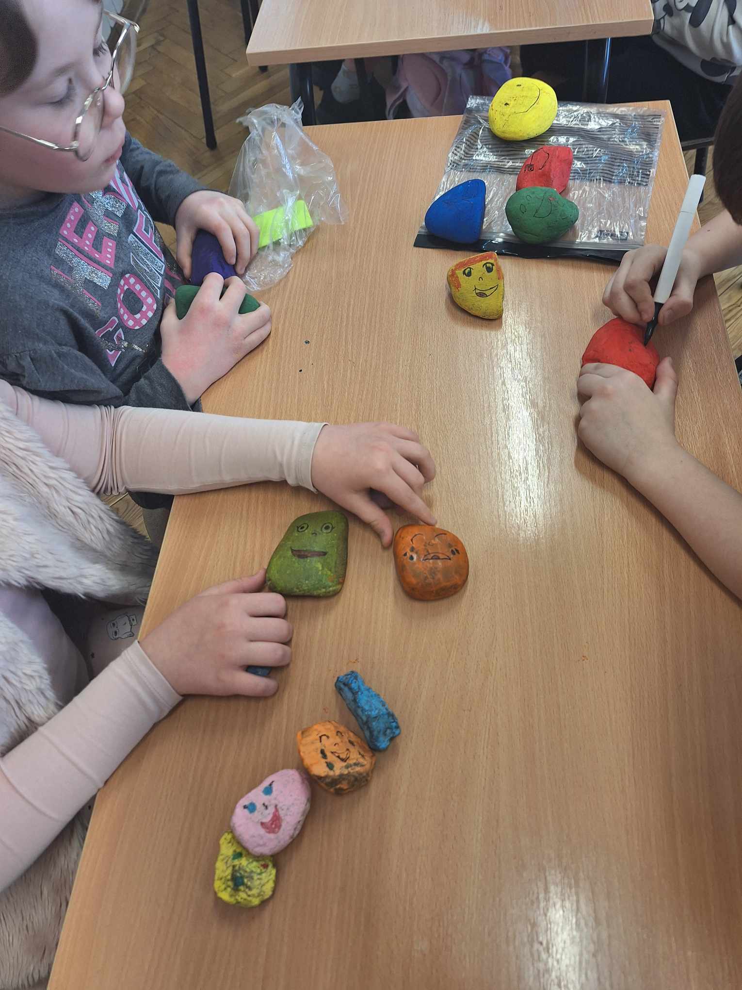 Najmłodsi uczniowie naszej szkoły podsumowując zajęcia stworzyli  kamyczkowe emotki. Praca nad nimi przyniosła im  wiele radości i satysfakcji.