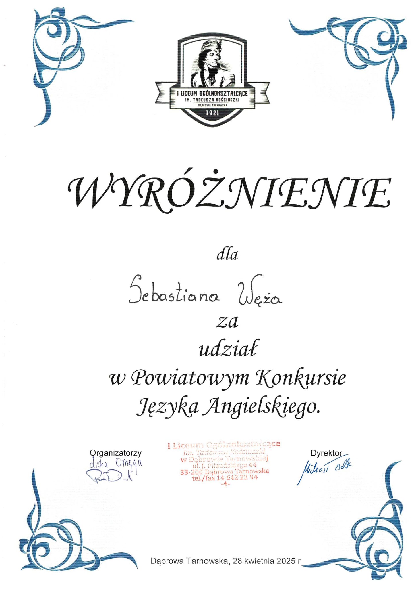 Gratulujemy Sebastianowi i życzymy sukcesów w kolejnych zmaganiach językowych!