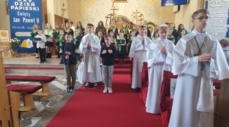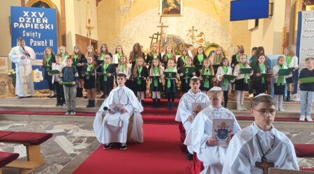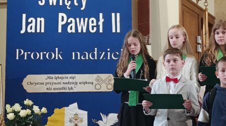 „Święty Jan Paweł II. Prorok nadziei” – to hasło tegorocznego, XXV Dnia Papieskiego, obchodzonego w niedzielę, 12 października. Zgodnie ze szkolną tradycją uczniowie naszej szkoły przygotowali montaż słowno-muzyczny, wzbogacony o okolicznościową dekorację. W montażu wystąpili uczniowie klas III-VIII, razem 34 osoby. Niecodzienne było pojawienie się aż czterech papieży: Jana Pawła II, Benedykta XVI, Franciszka i Leona XIV, którzy byli symbolami ciągłości Kościoła i przekazywanych treści.