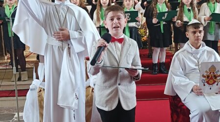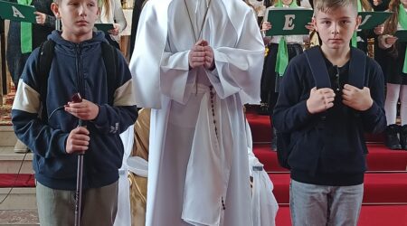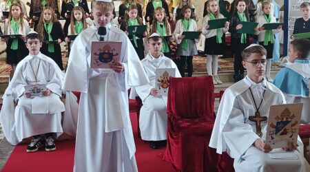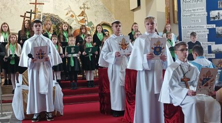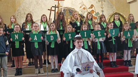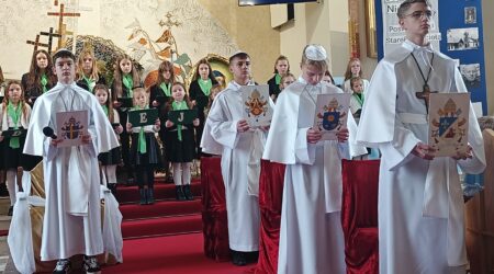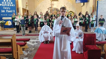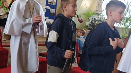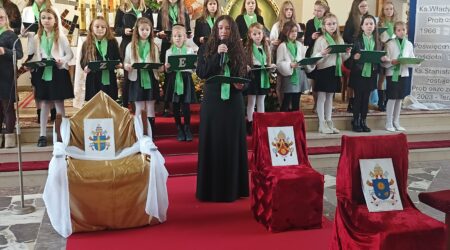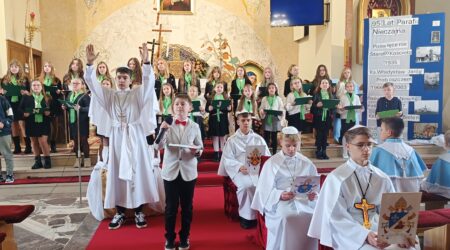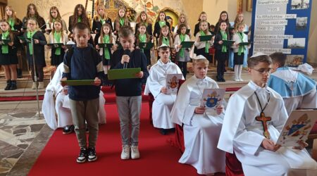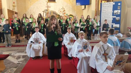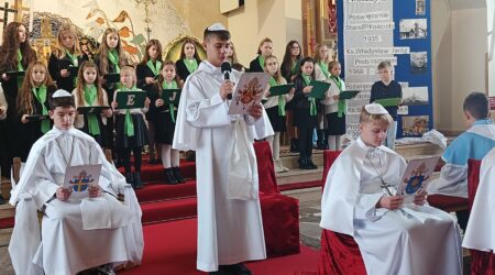Uczniowie wystąpili dwukrotnie na początku przedpołudniowych Mszy Świętych. Zostali przygotowani przez nauczycieli: Irenę Klich i Waldemara Szloska.